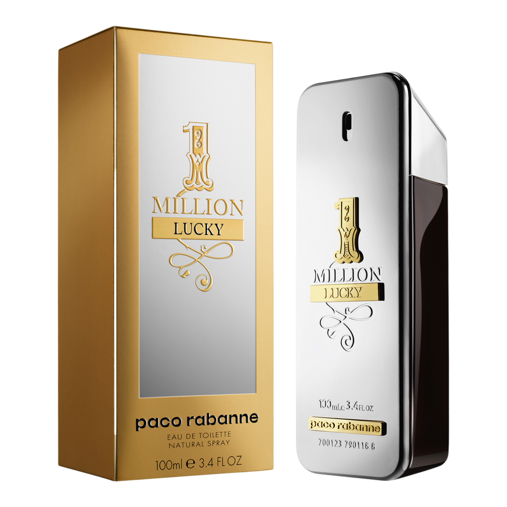 One Million Lucky is a men's cologne introduced by Paco Rabanne in 2019. It has a woody, spicy aroma, with top notes of pink peppercorn, cardamom, and grapefruit. The heart of the fragrance is made up of lavender, nutmeg, and apple, while the base notes contain amber, patchouli, and cashmere woods. The scent is designed to make the wearer feel confident and attract positive attention.